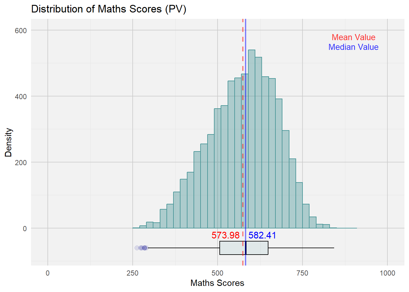labs(title = "Distribution of Maths Scores (PV)", x = "Maths Scores", y = "Density") +