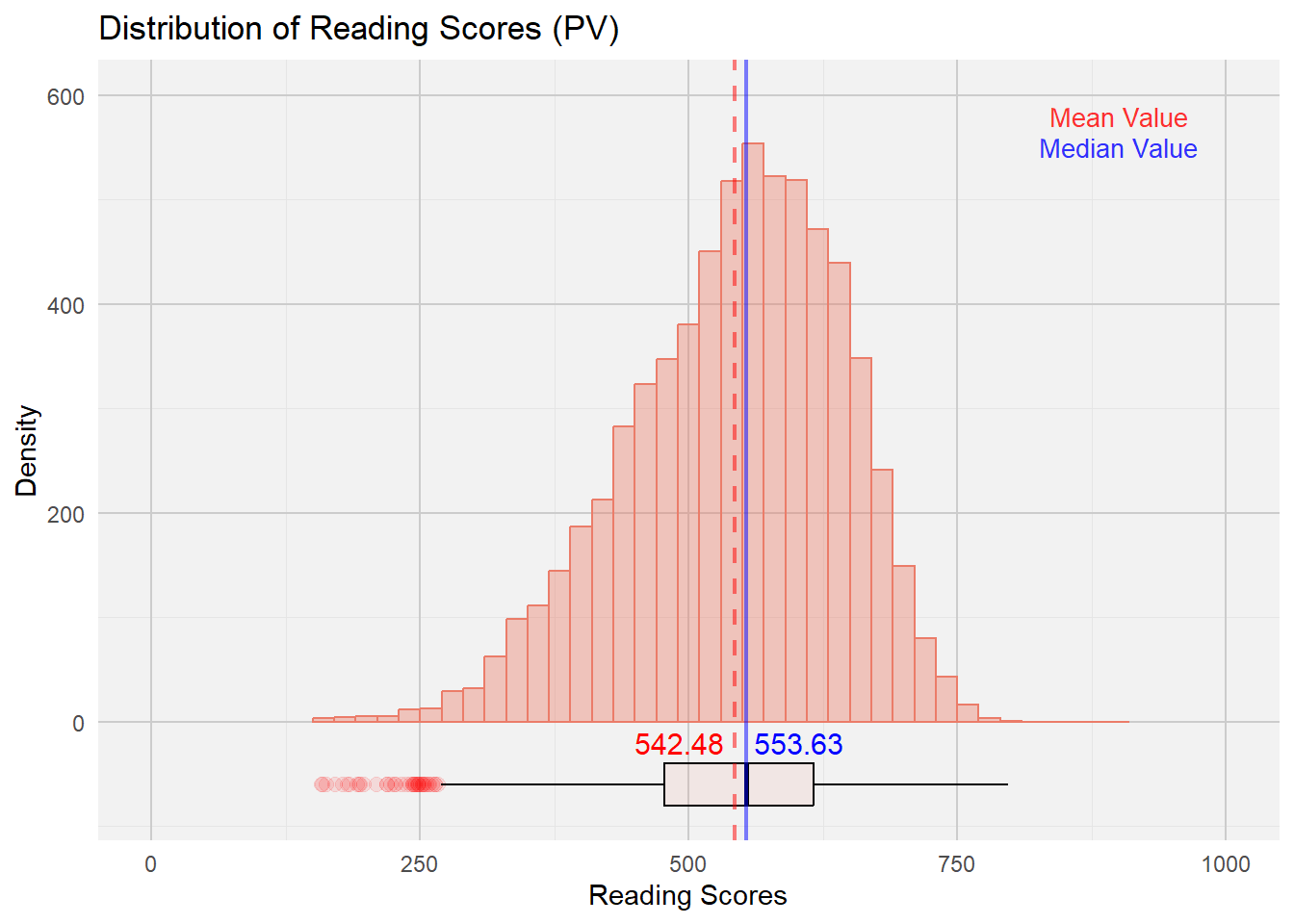 labs(title = "Distribution of Reading Scores (PV)", x = "Reading Scores", y = "Density") +