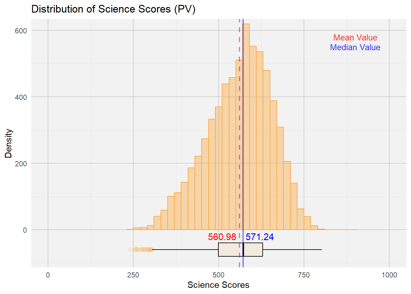 labs(title = "Distribution of Science Scores (PV)", x = "Science Scores", y = "Density") +