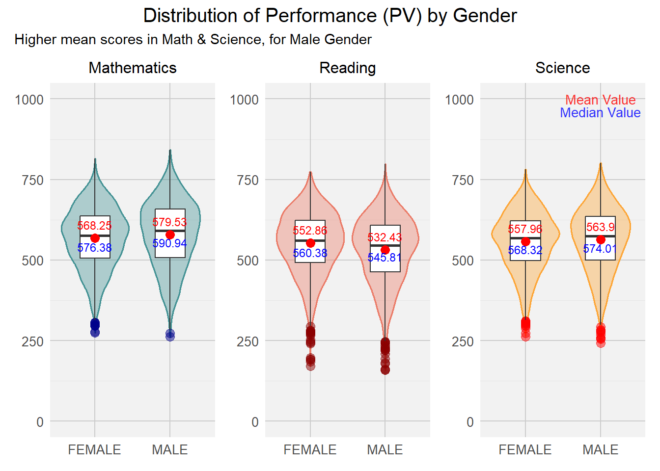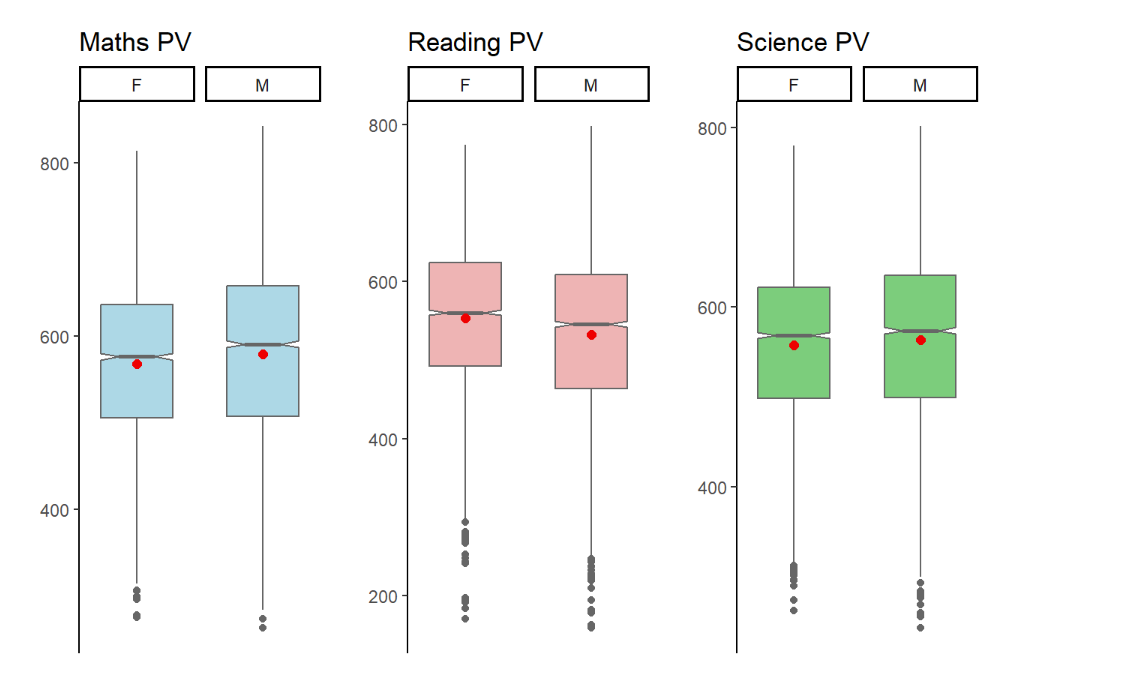 In this visualisation, the author created boxplots to show the Reading PVs across 3 subjects by Gender.