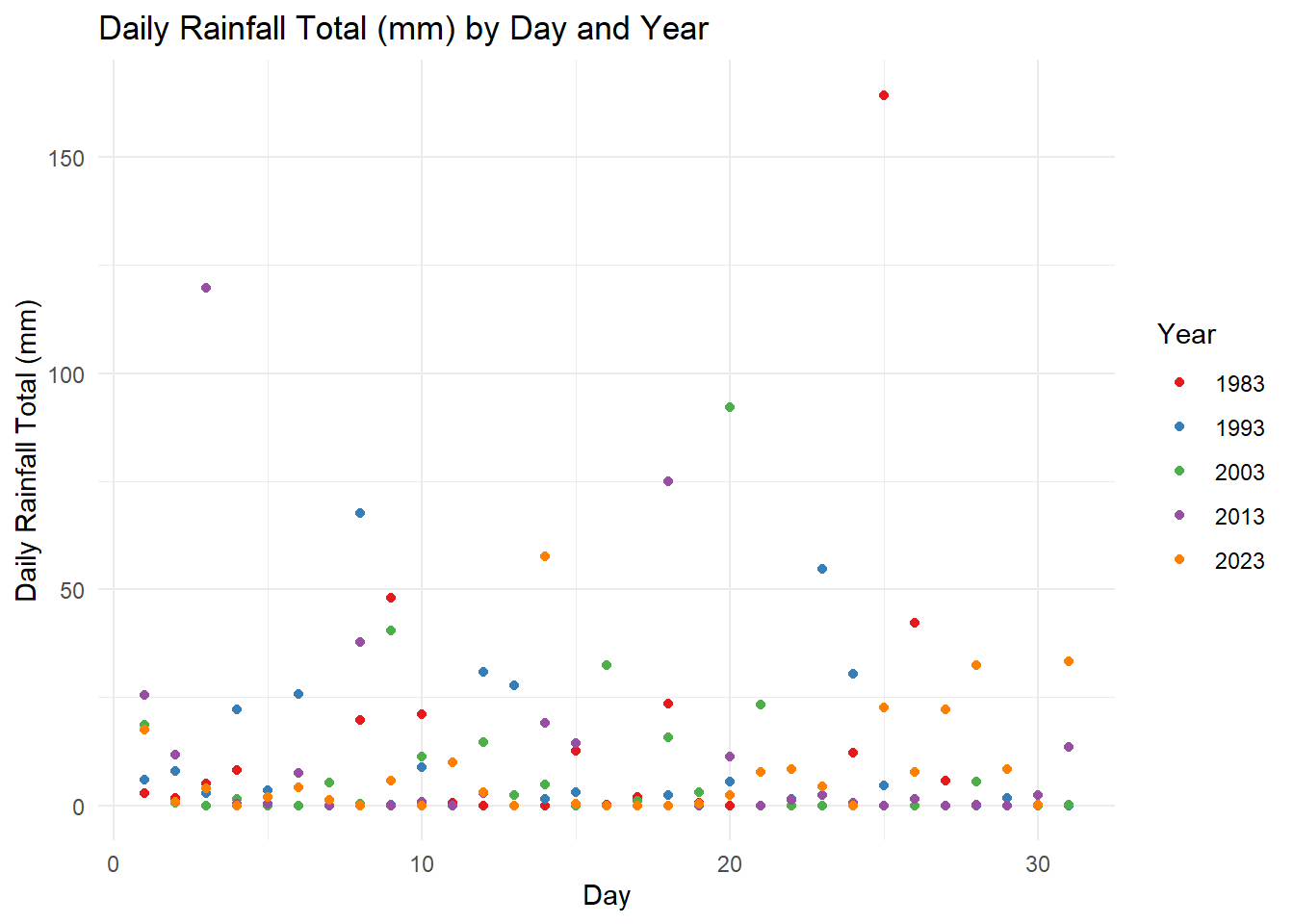 2) in the years 1983 and 2013, where the total rainfall on day 25 and day 3 were above 100mm. We can infer that these were anomalies with significantly heavy rainfall as compared to the volumes of other rainy days by year.