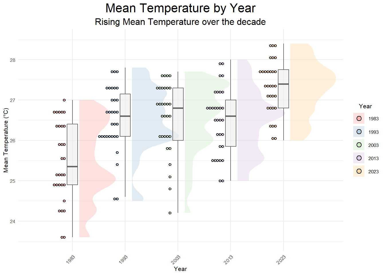 p <- ggplot(temp_table_2, aes(x = Year, y = `Mean Temperature (°C)`, fill = Year)) +
